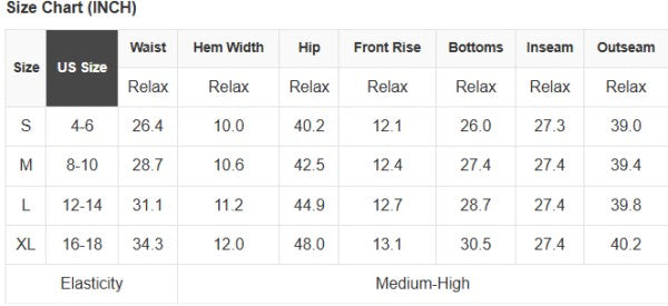 L: (Waist), (Hips), (Inseam), (Length)