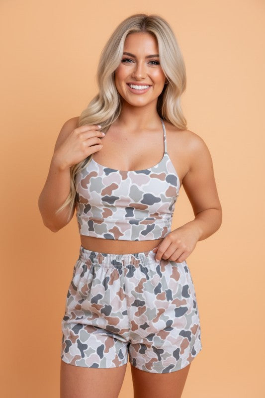 Effortlessly transition from gym to street in this chic camo cropped tank and shorts set. Designed for the modern woman who refuses to compromise on style or comfort, this two-piece athleisure ensemble features a fitted cropped tank paired with relaxed-fit shorts that flatter every silhouette. The high-rise waist provides gentle support while functional side pockets keep your essentials close. Crafted from a premium polyester-spandex blend, the fabric moves with you-stretchy enough for your most active days, durable enough for everyday wear. The timeless camouflage print adds an edge to your casual rotation, making this set your go-to for errands, workouts, or weekend adventures. Polyester/Spandex